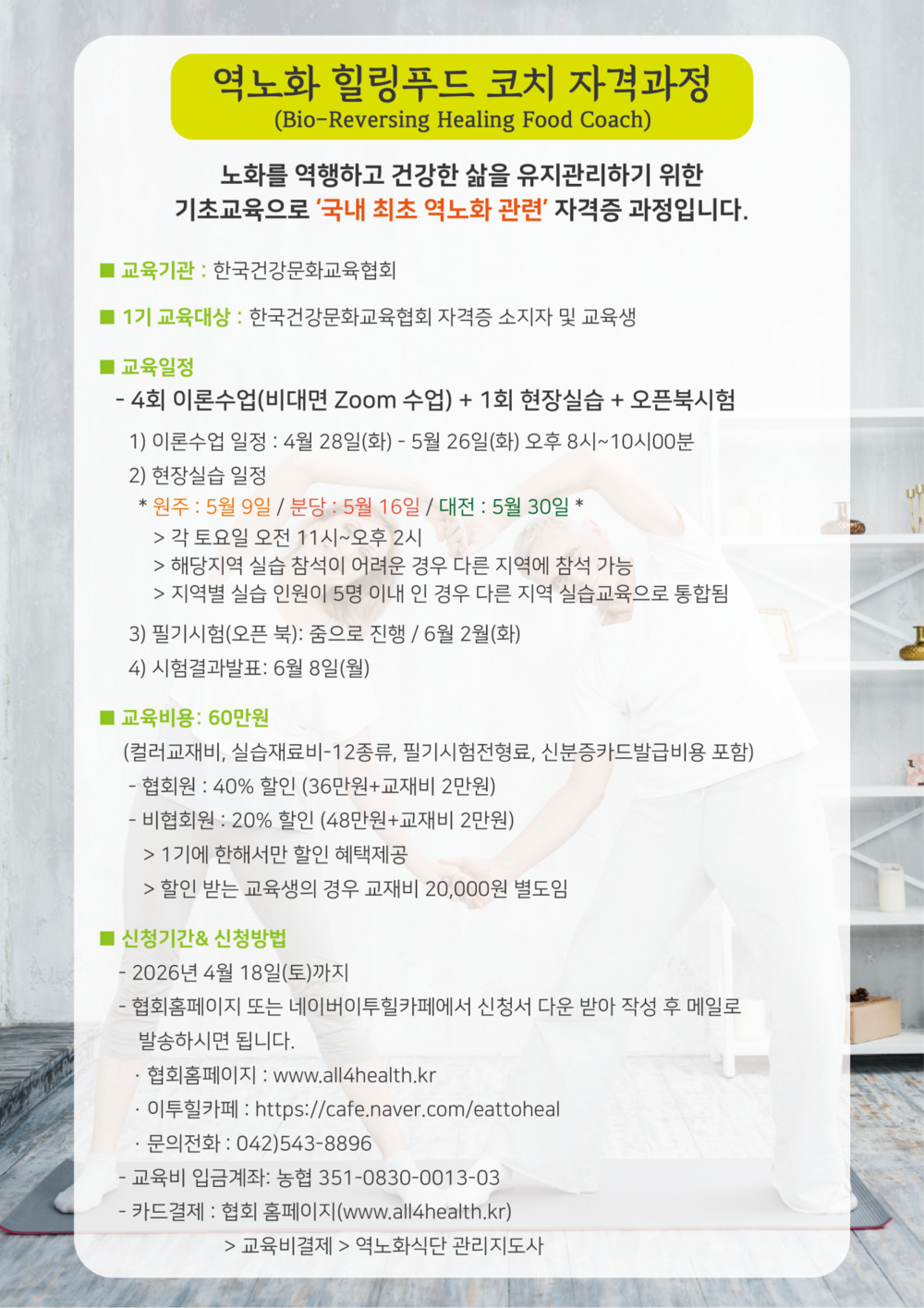 - 협회원 : 40% 할인 (36만원+교재비 2만원)
