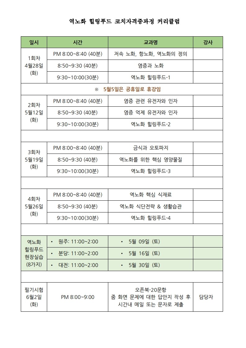 1) 이론수업 일정 : 4월 28일(화) - 5월 26일(화) 오후 8시~10시00분